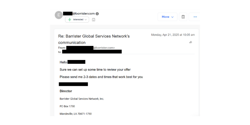 Achievement: Direct engagement and offer review invitation from a US-based global services company