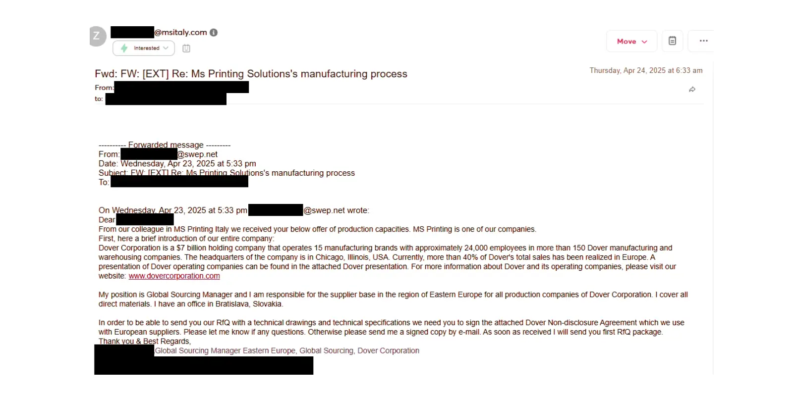 - Real Conversations, Fast: In just 24 hours, the exchange escalated to a senior Global Sourcing Manager who laid out the next steps—right up to NDA signing and discussing technical requirements.